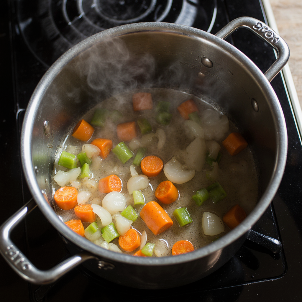 Heat olive oil in a large pot. Add onion, carrots, and celery. Cook for 5–6 minutes, until the vegetables become soft and fragrant. Stir in garlic and cook for one more minute.