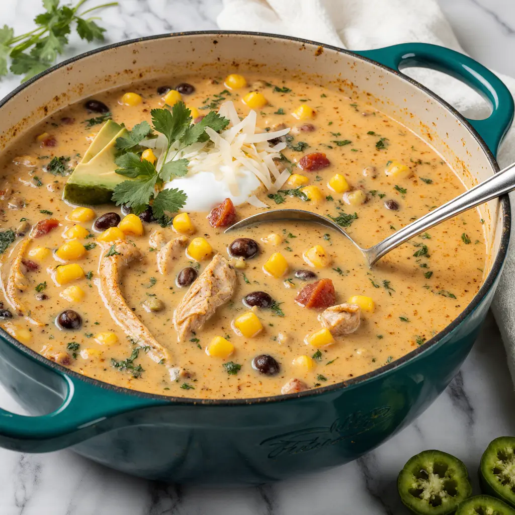 5. 5. Add the Main Ingredients: Add the shredded chicken, rinsed black beans, and frozen corn to the pot. Stir to combine and return to a simmer.